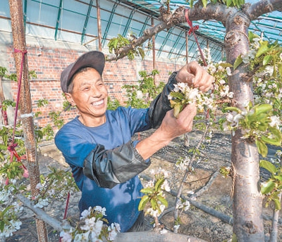 新疆生產(chǎn)建設(shè)兵團第十師一八八團海川鎮(zhèn)櫻桃大棚內(nèi),種植戶正在管護櫻桃樹。