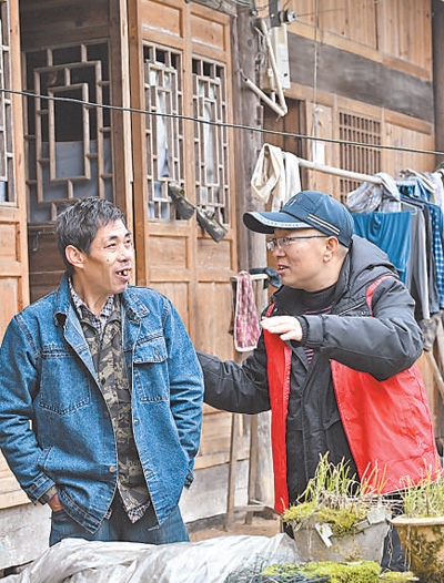 在湖南省湘西土家族苗族自治州花垣縣邊城鎮(zhèn)通州村,駐村工作隊隊員(右)與村民交流。