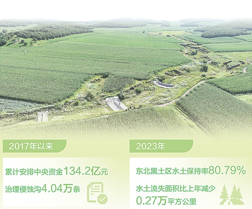 2017年以來,水利部會同財政部累計安排中央資金134.2億元,治理侵蝕溝4.04萬條,其中2023年增發(fā)國債用于支持東北黑土區(qū)侵蝕溝治理項目,中央資金投入98.3億元,治理侵蝕溝2.77萬條。