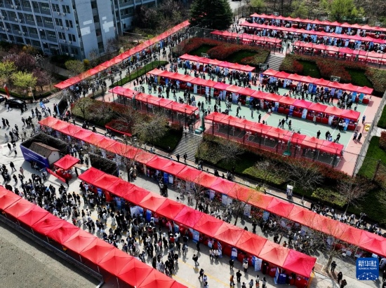 這是4月11日在山東青島科技大學拍攝的2025年春季綜合類大型雙選會招聘活動現(xiàn)場(無人機照片)。
