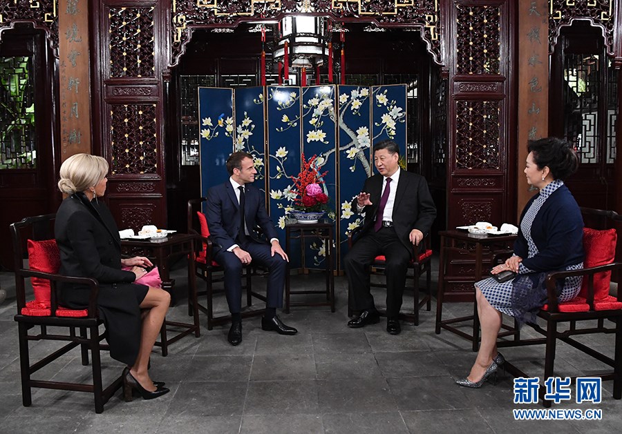 兩國(guó)元首夫婦在玉華堂落座。習(xí)近平和彭麗媛愉快地憶及今年3月訪問(wèn)法國(guó)受到馬克龍夫婦熱情款待的情景。習(xí)近平說(shuō),歡迎馬克龍總統(tǒng)再次訪華并第一次來(lái)上海。上海是中國(guó)改革開(kāi)放和發(fā)展進(jìn)步的縮影,體現(xiàn)了近代以來(lái)中國(guó)同世界關(guān)系的演變。希望這次訪問(wèn)有助于你了解上海、了解中國(guó)。我和夫人選擇在豫園款待總統(tǒng)先生和夫人,希望你們能領(lǐng)略中華園林之美和中國(guó)的傳統(tǒng)文化。文化藝術(shù)表現(xiàn)形式不同,但帶給不同國(guó)家民眾的心靈體驗(yàn)是相通的,不同文化可以和諧共生。中法作為東西方兩大文明代表,應(yīng)該相互尊重,交流互鑒,各美其美,美美與共。