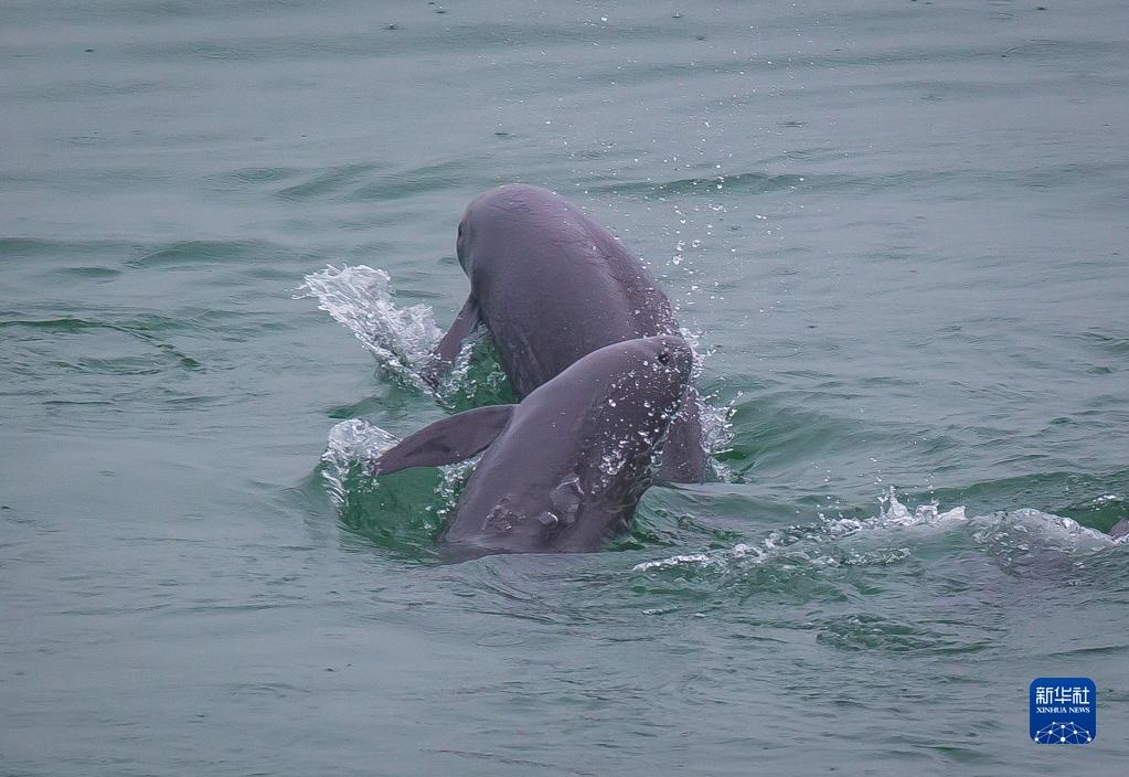 5月10日,在湖北省宜昌市江邊,長(zhǎng)江江豚在水中嬉戲。新華社記者肖藝九攝