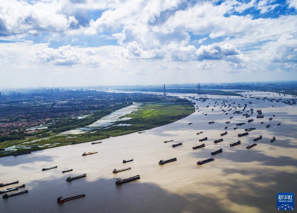 船舶在湖北省武漢市陽邏港區(qū)水域行駛(2018年8月13日攝,無人機(jī)照片)。新華社記者 肖藝九 攝