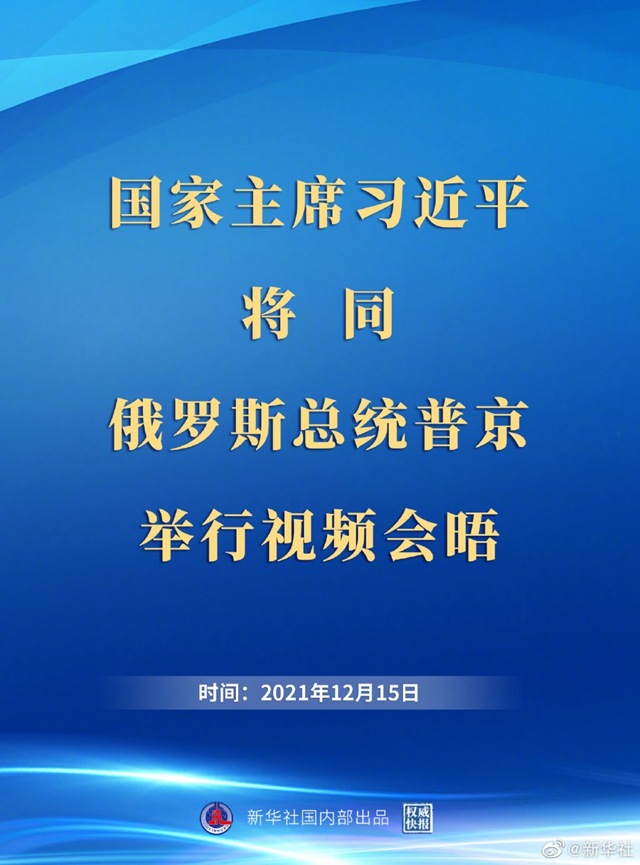 外交部發(fā)言人華春瑩12月13日宣布:國家主席習(xí)近平將于12月15日在北京同俄羅斯聯(lián)邦總統(tǒng)普京舉行視頻會晤。