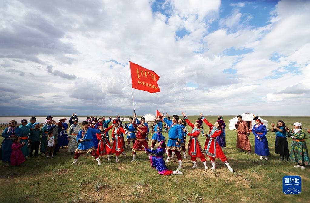 2018年8月22日,內(nèi)蒙古蘇尼特右旗烏蘭牧騎隊(duì)員在牧區(qū)演出。新華社發(fā)(東哈達(dá)/攝)