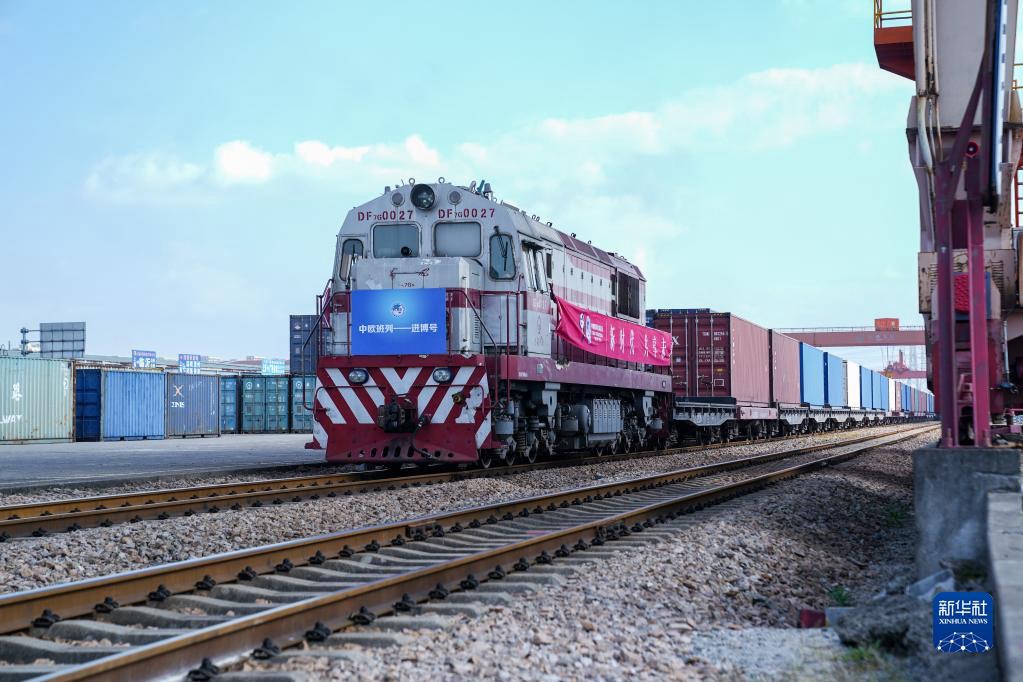2021年10月29日,首班“中歐班列—進(jìn)博號(hào)”列車(chē)抵達(dá)上海。當(dāng)日,首班“中歐班列—進(jìn)博號(hào)”到達(dá)上海,從德國(guó)漢堡出發(fā)的該趟班列上裝載了智能真空噴射沖洗系統(tǒng)、電機(jī)零件等第四屆中國(guó)國(guó)際進(jìn)口博覽會(huì)參展展品,這也是進(jìn)博會(huì)展品首次坐中歐班列直達(dá)上海。新華社記者 丁汀 攝