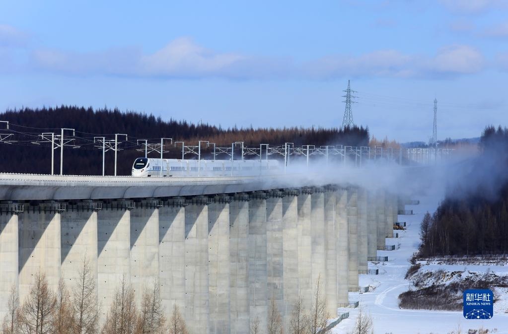 試運(yùn)行期間,高鐵列車(chē)行駛在沈佳高鐵白敦段上(2021年12月3日攝,無(wú)人機(jī)照片)。2021年12月24日,沈陽(yáng)至佳木斯高鐵長(zhǎng)白山至敦化段正式開(kāi)通運(yùn)營(yíng),長(zhǎng)白山風(fēng)景區(qū)接入全國(guó)高鐵網(wǎng),長(zhǎng)春至長(zhǎng)白山最快2小時(shí)18分可達(dá)。沈佳高鐵白敦段位于吉林省延邊朝鮮族自治州境內(nèi),設(shè)計(jì)時(shí)速250公里,由于其穿越原始森林,被譽(yù)為“森林高鐵”。新華社發(fā)(劉慎庫(kù) 攝)