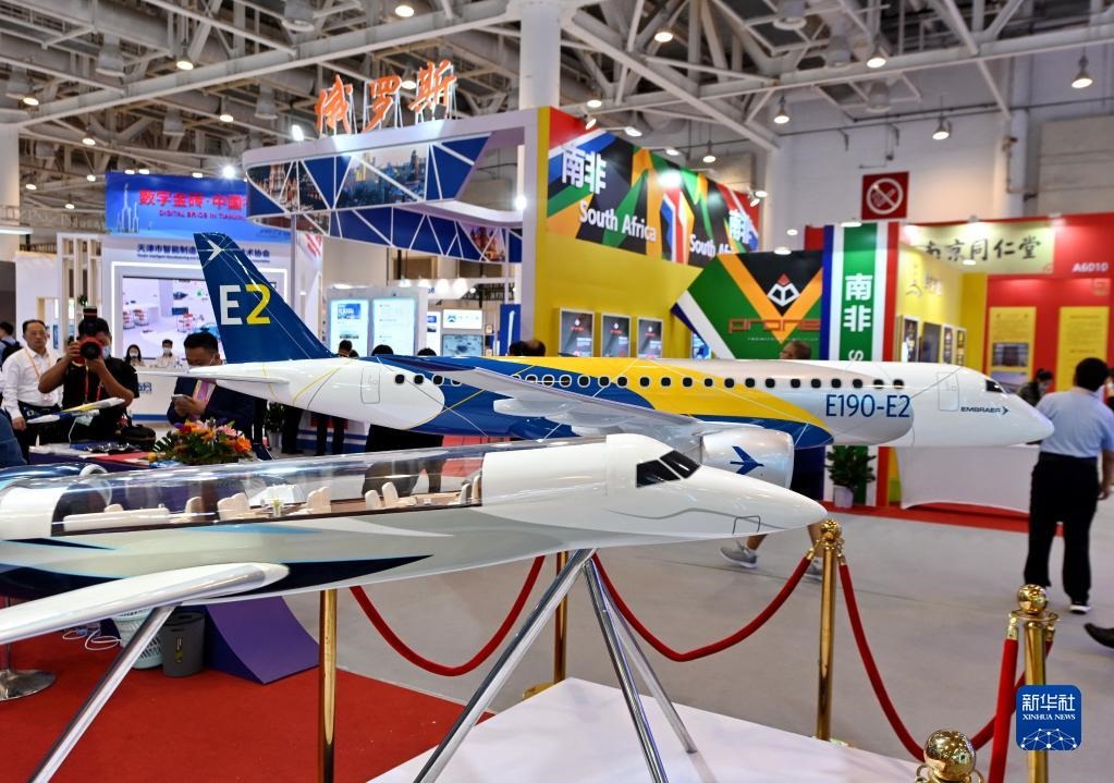 參觀者從2021金磚國(guó)家新工業(yè)革命展展出的飛機(jī)模型前走過(guò)(2021年9月8日攝)。新華社記者林善傳攝