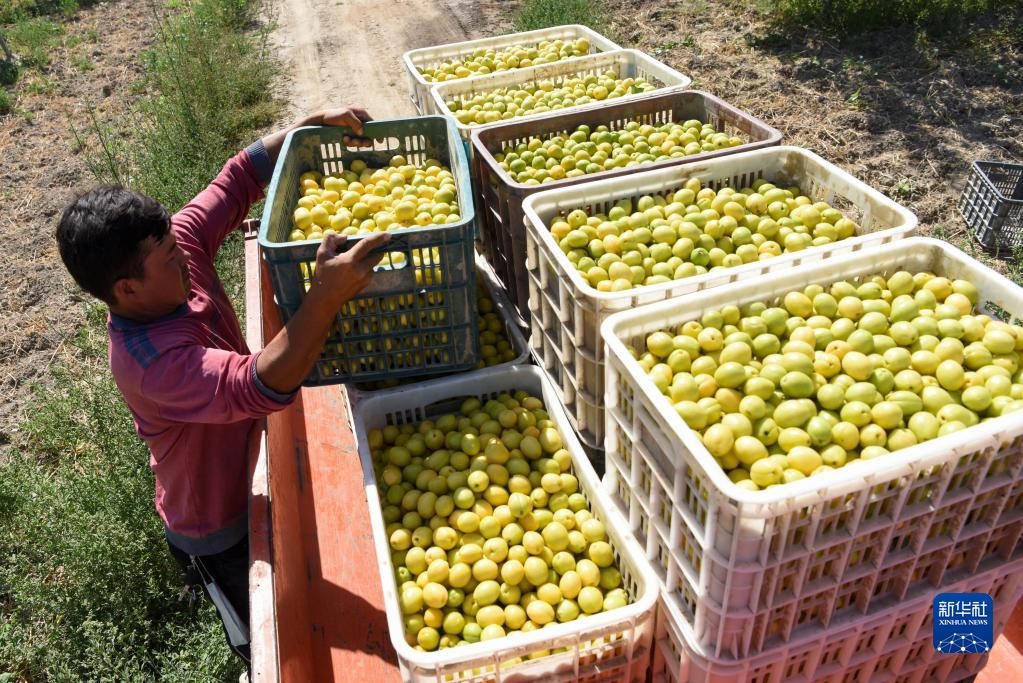 在新疆阿克蘇地區(qū)庫(kù)車(chē)市齊滿(mǎn)鎮(zhèn)齊滿(mǎn)村,農(nóng)戶(hù)將采摘的小白杏裝車(chē)(2021年7月1日攝)。新華社記者 丁磊 攝