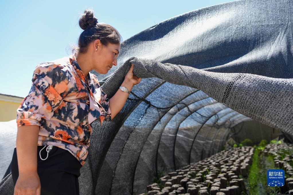 在新疆烏什縣依麻木鎮(zhèn),在新疆維吾爾自治區(qū)黨委組織部、老干部局駐托萬(wàn)克麥蓋提村“訪(fǎng)民情惠民生聚民心”工作隊(duì)的幫助下,不少村民通過(guò)培植木耳增收致富(2022年6月7日攝)。新華社記者 丁磊 攝