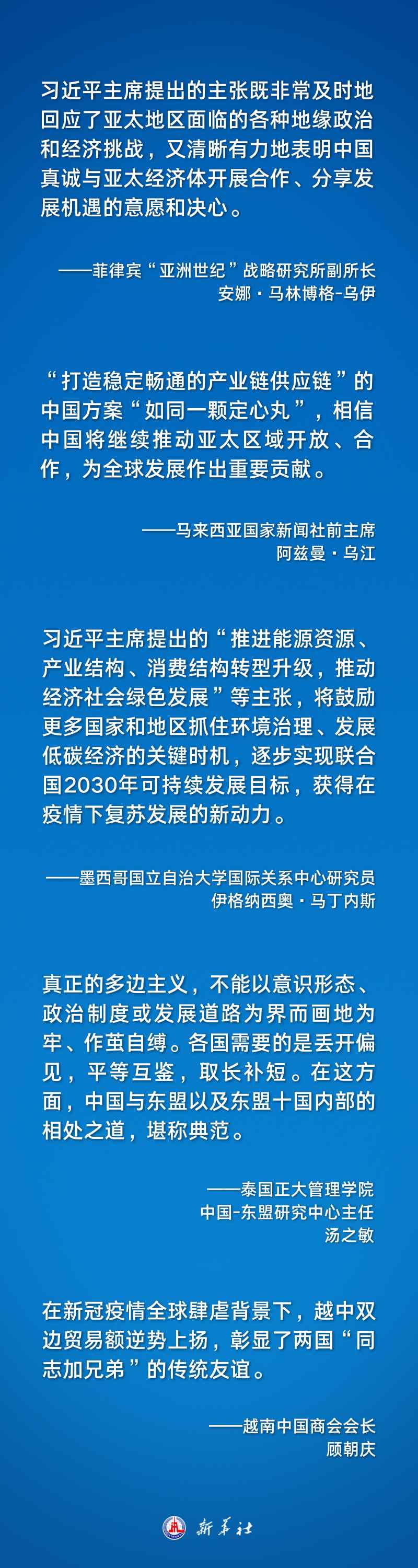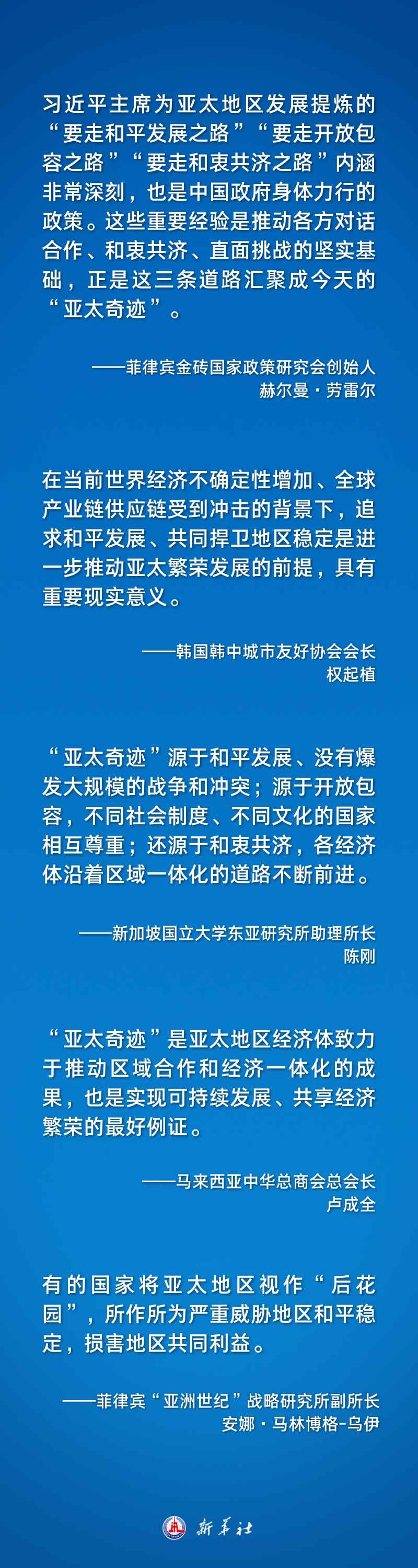 習(xí)近平主席的系列重要講話在國際社會(huì)引發(fā)熱烈反響。多國人士認(rèn)為,習(xí)近平主席全面總結(jié)了“亞太奇跡”的經(jīng)驗(yàn)與啟示,就攜手構(gòu)建亞太命運(yùn)共同體提出重要主張,深刻闡釋了中國式現(xiàn)代化的機(jī)遇與貢獻(xiàn),為再創(chuàng)亞太合作新輝煌注入強(qiáng)勁動(dòng)力。