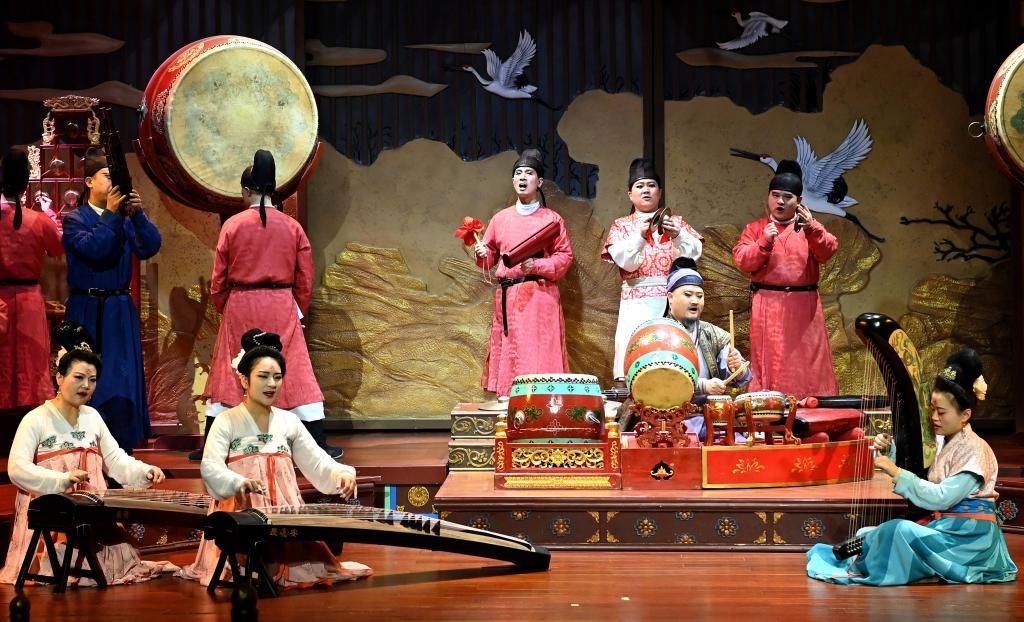 2023年1月24日,西安大唐芙蓉園內(nèi)上演的舞臺劇《鼓》。新華社記者 劉瀟 攝