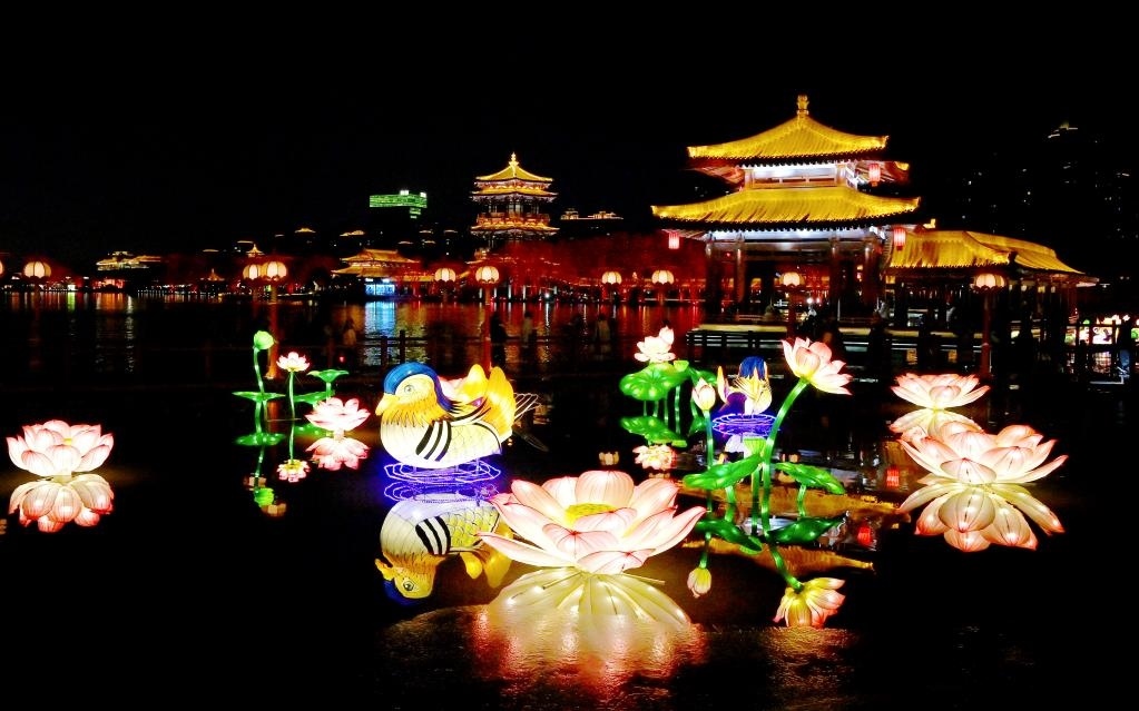 2023年1月24日在西安大唐芙蓉園拍攝的花燈(無人機(jī)照片)。新華社記者 劉瀟 攝