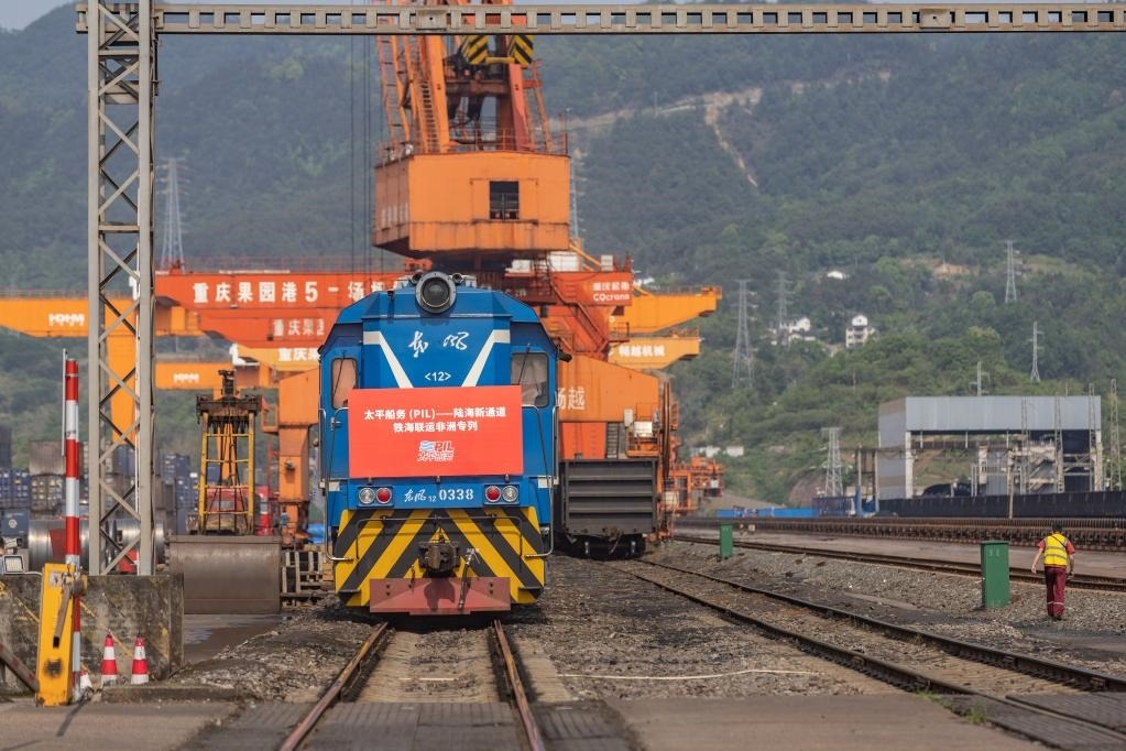 這是2023年4月27日,太平船務——西部陸海新通道江鐵海聯(lián)運非洲專列在重慶果園港魚嘴站等待發(fā)車。