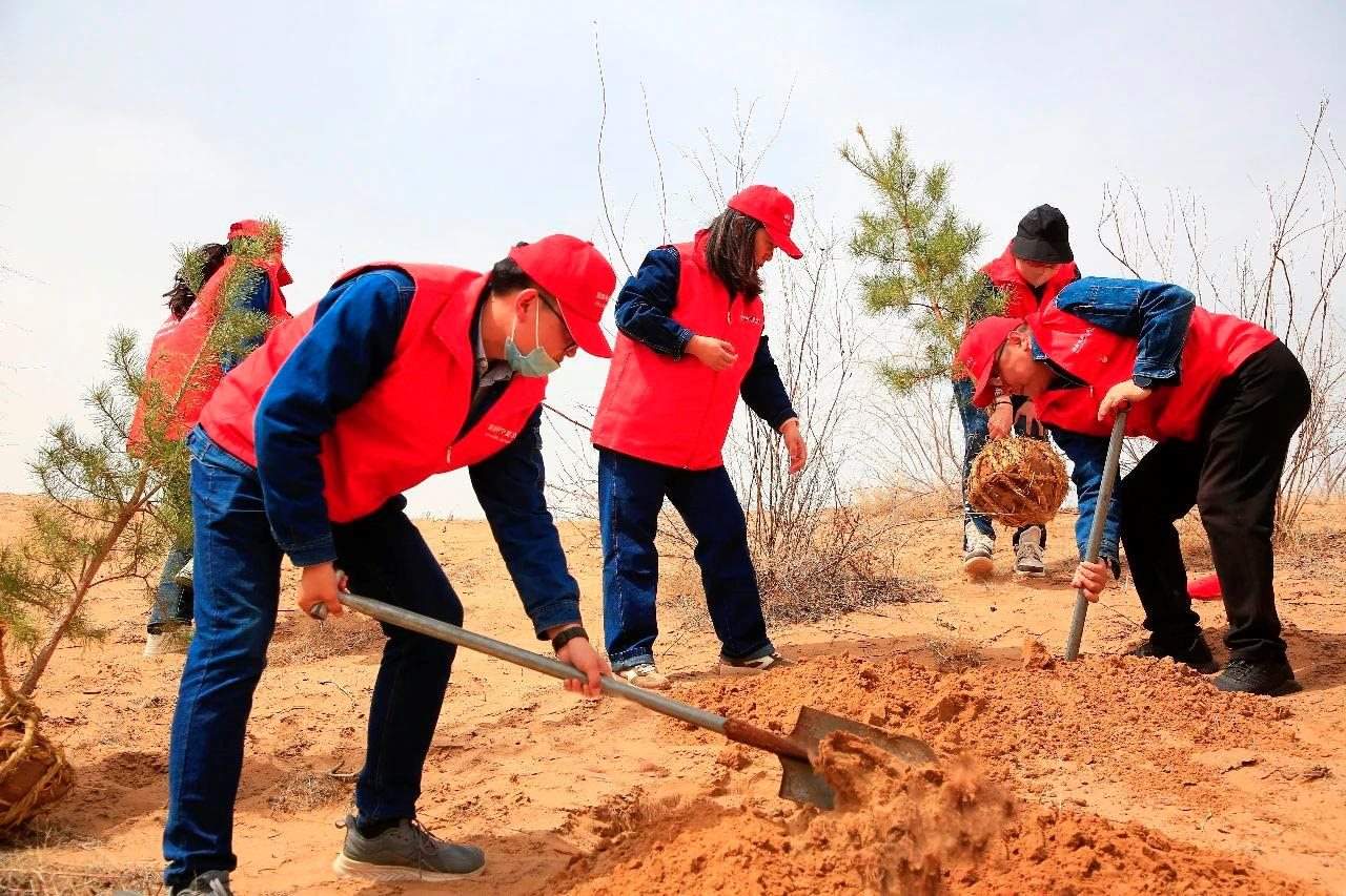 △2023年4月12日,志愿者在寧夏靈武白芨灘國家級自然保護區(qū)開展義務植樹、扎草方格。