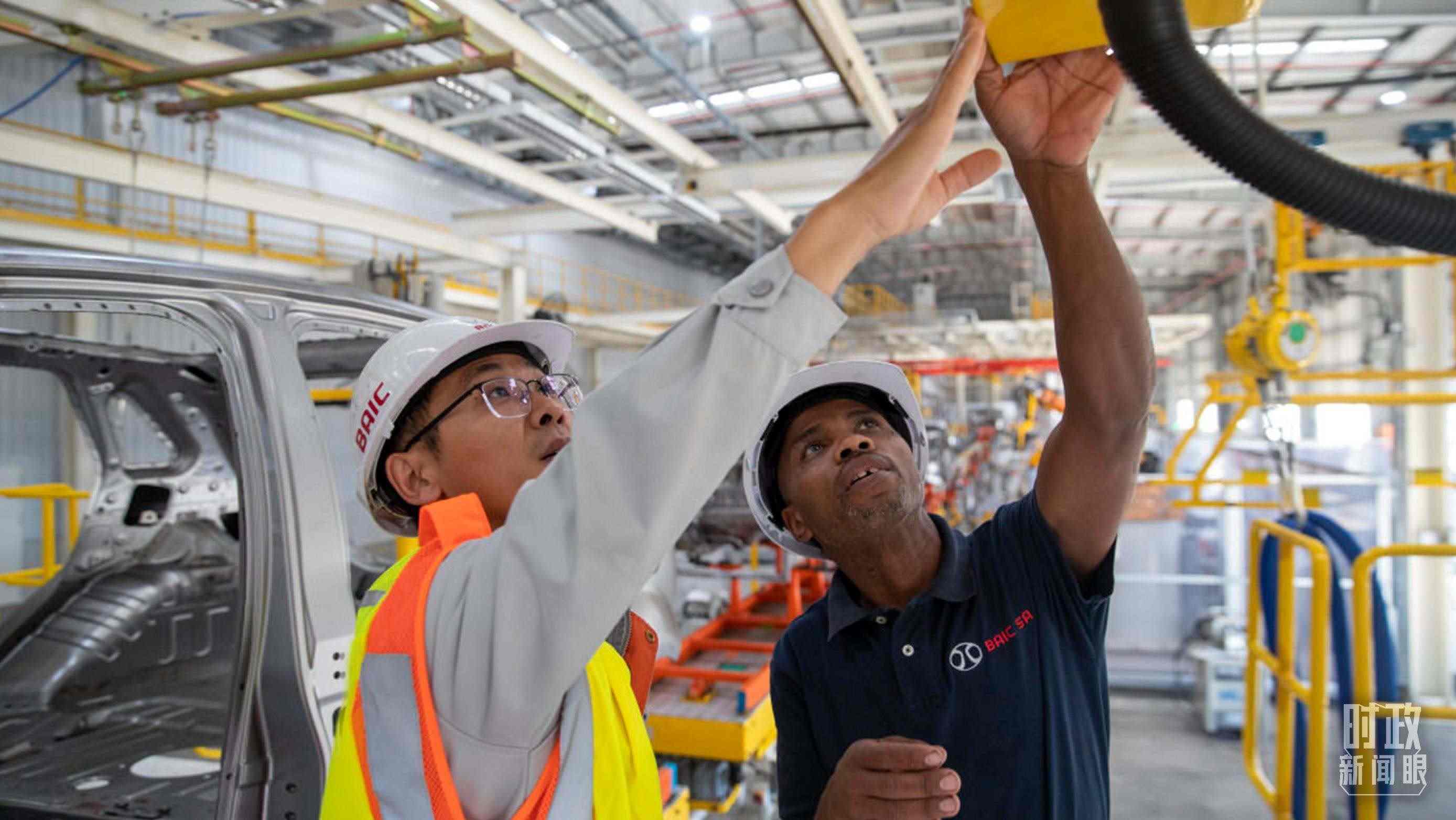 △在南非東開普省北汽南非工廠,當?shù)貑T工與中國同事在焊裝車間內工作。(資料圖)