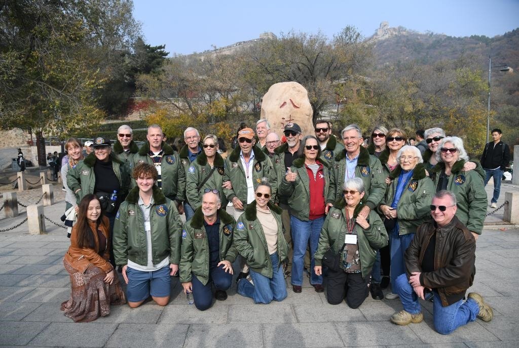 2023年10月29日,飛虎隊(duì)老兵莫耶一行人在北京八達(dá)嶺長(zhǎng)城合影留念。當(dāng)日,美中航空遺產(chǎn)基金會(huì)訪(fǎng)華代表團(tuán)成員陸續(xù)抵達(dá)北京。新華社記者 任超 攝