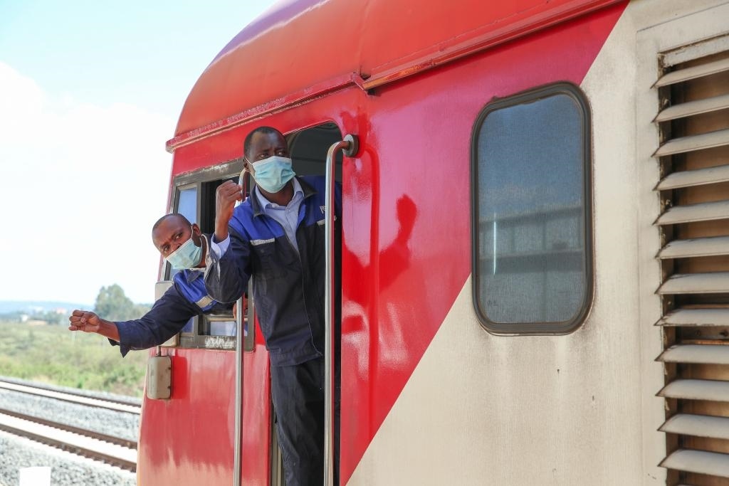 2022年3月25日,在肯尼亞內(nèi)羅畢,蒙內(nèi)鐵路肯方機車獨立班組成員與站臺工作人員確認(rèn)安全。