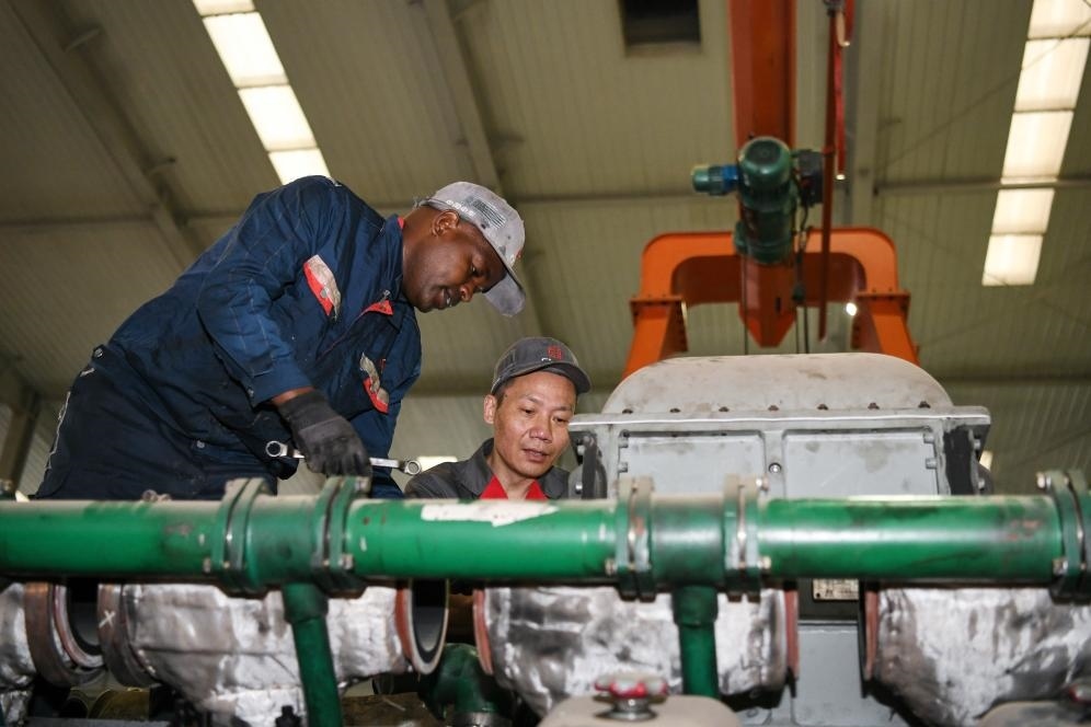 2023年7月4日,中國中車駐肯員工和肯方員工在肯尼亞內(nèi)羅畢的蒙內(nèi)鐵路機車維保車間工作。