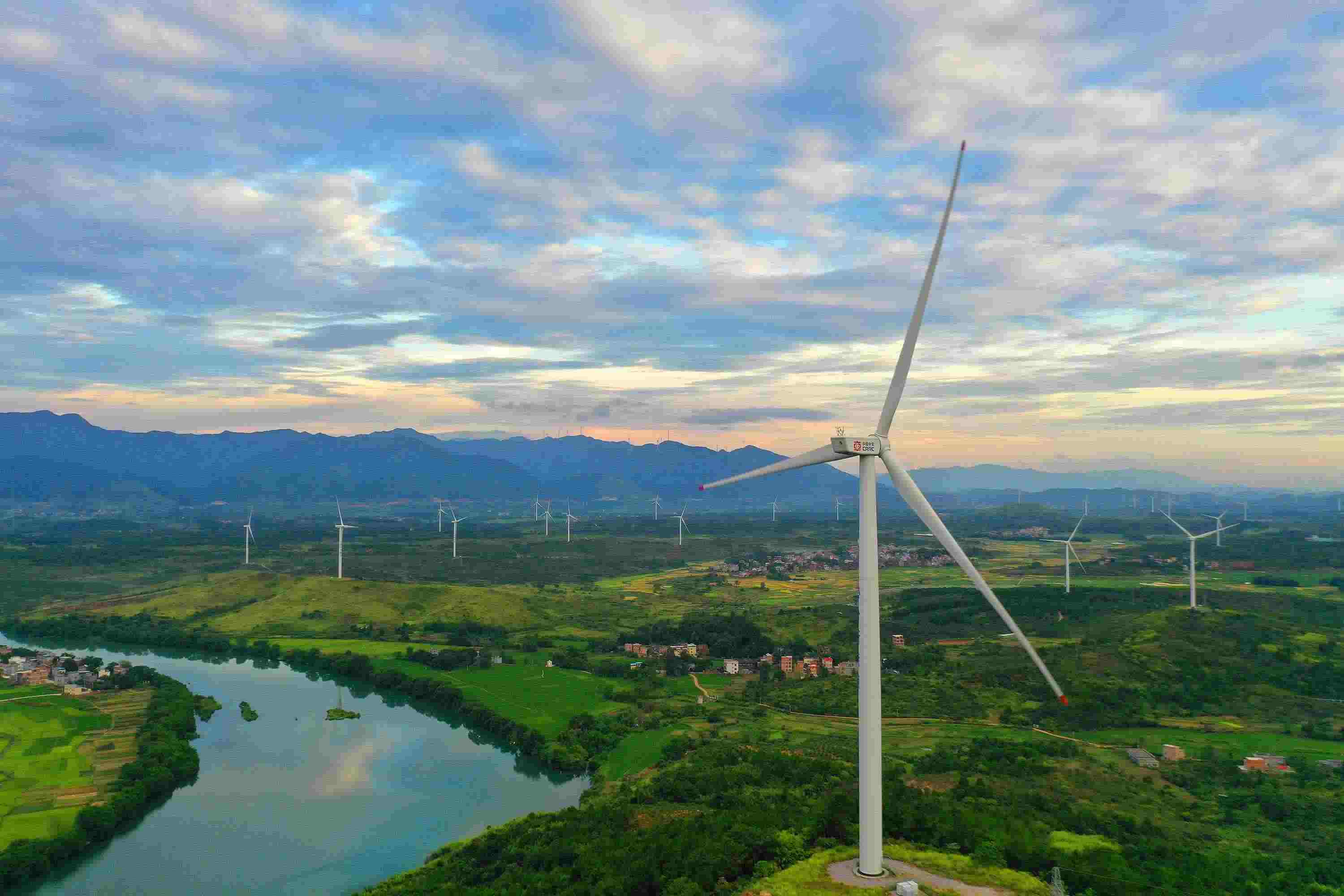 △ 湖南省永州市的風(fēng)力發(fā)電風(fēng)車與藍(lán)天、綠水、田野交相輝映,構(gòu)成一幅美麗的生態(tài)畫卷。