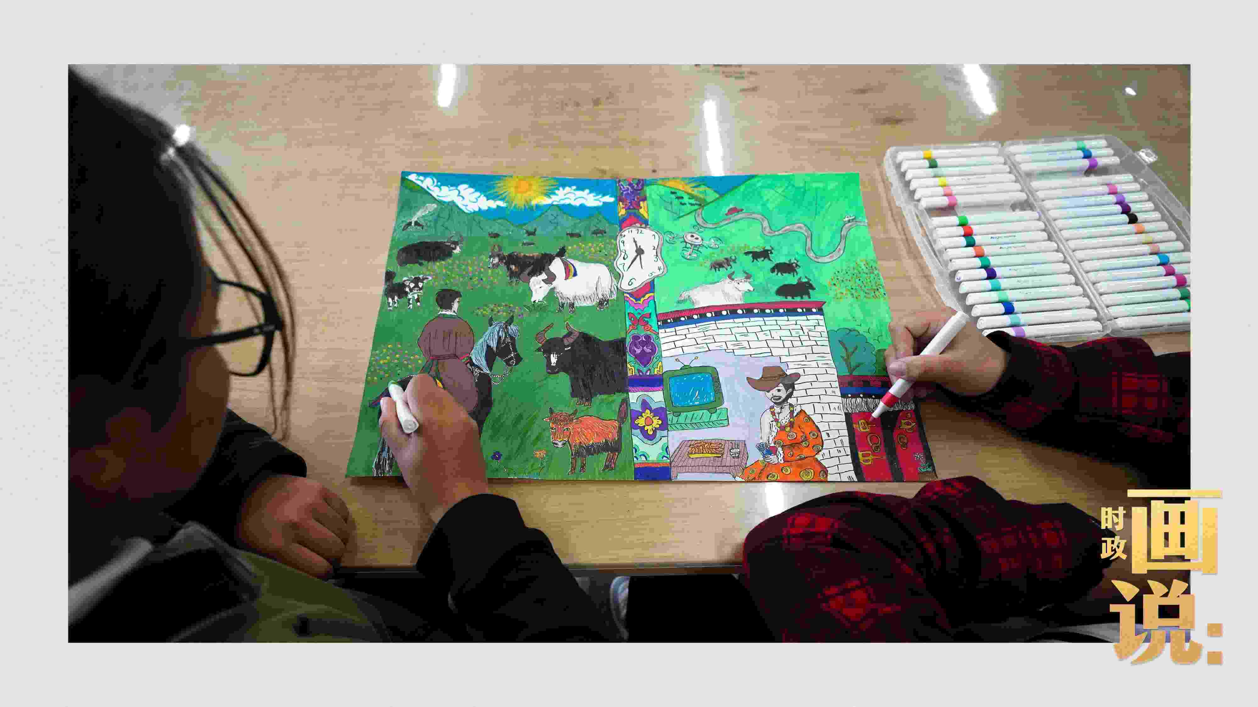 △高一(1)班學生肉昂吉和才央措姐妹一起描繪家鄉(xiāng)果洛的新變化。