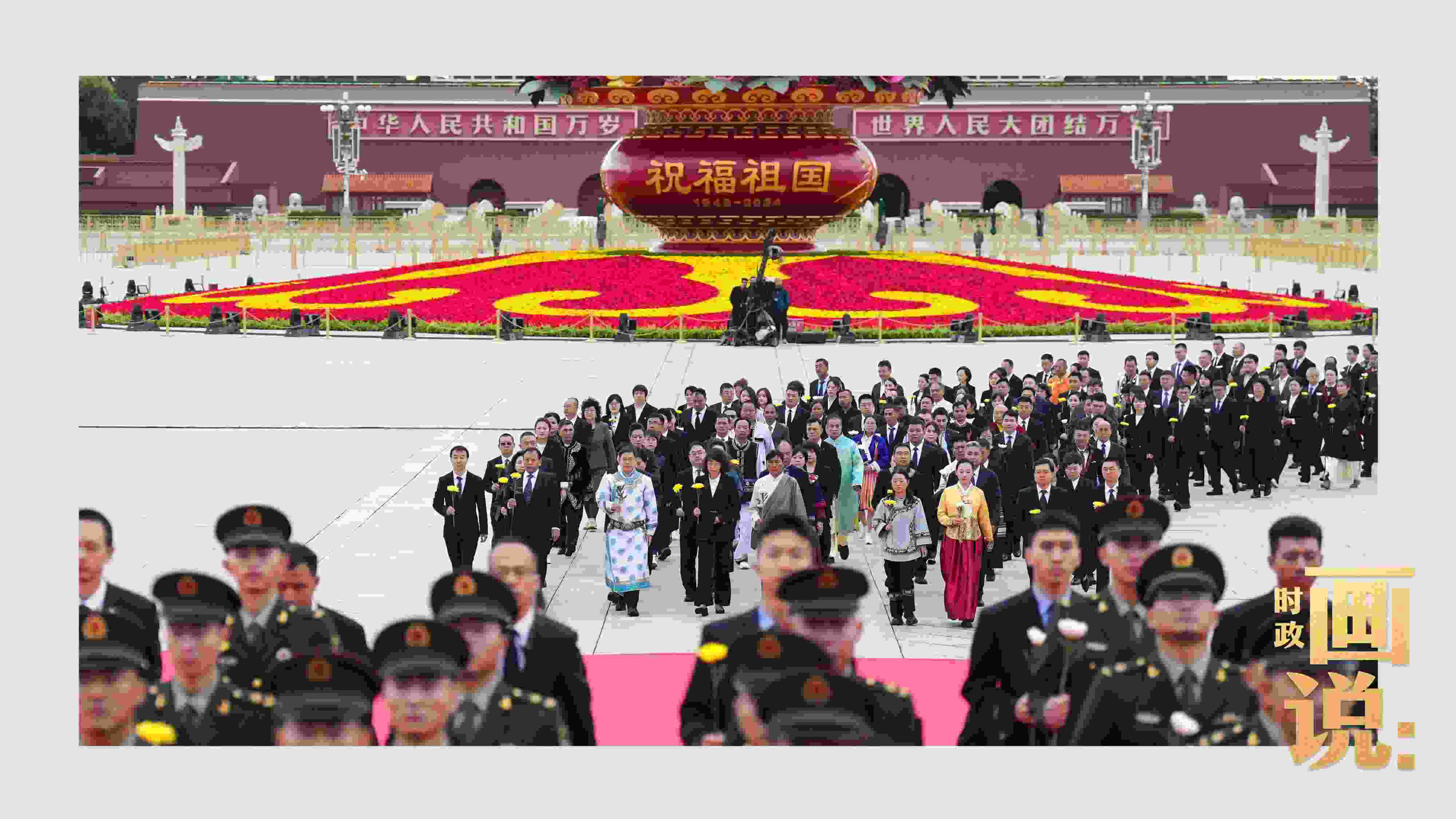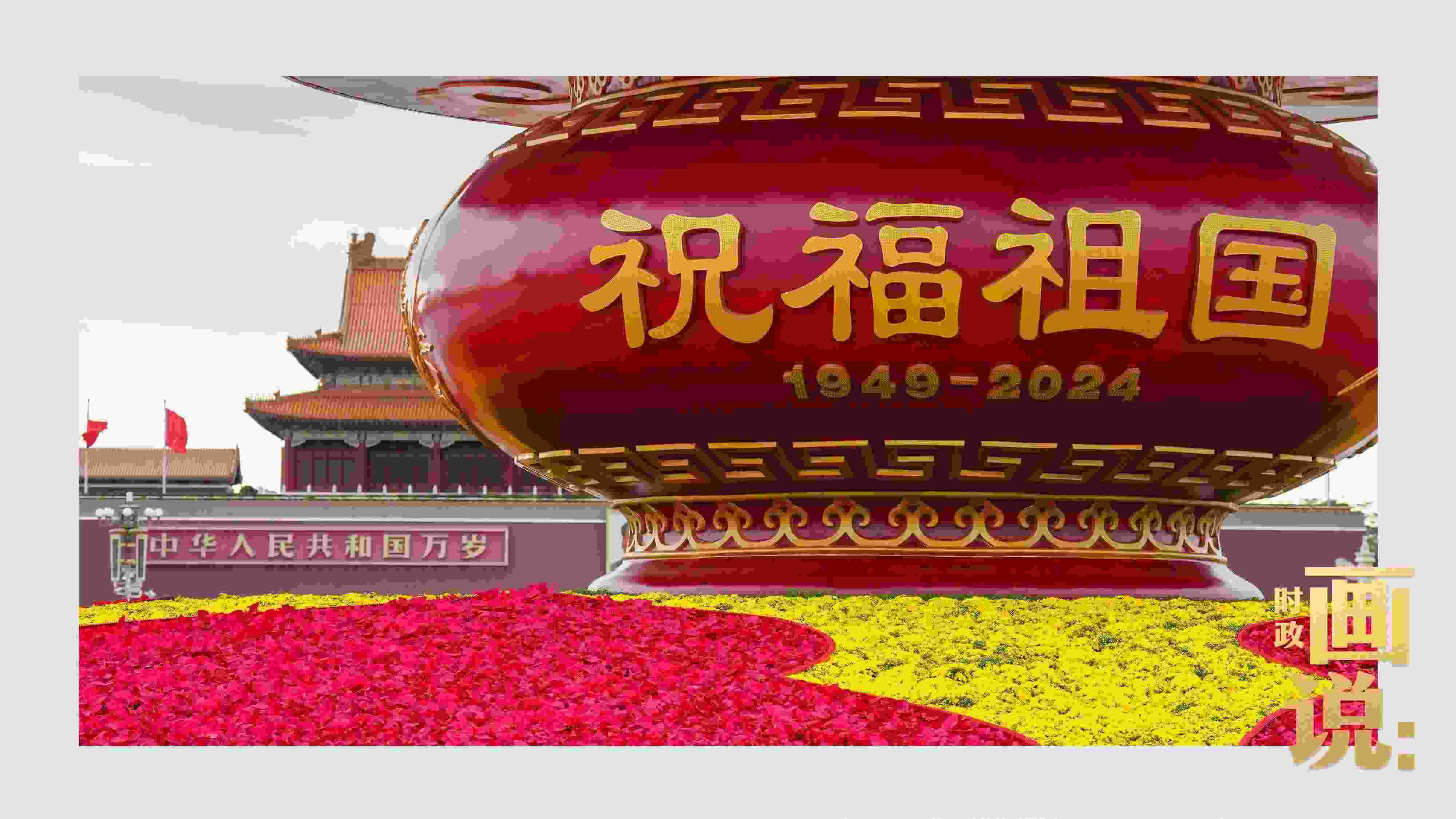 △天安門廣場(chǎng)中央,“祝福祖國”巨型花籃表達(dá)著對(duì)國家繁榮富強(qiáng)的美好祝福。