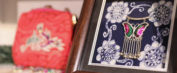 紅、綠、藍、黃……飛針走線五彩繽紛;繡、插、點、挑……制作手法千變?nèi)f化;龍鳳紋、魚鳥紋、蝴蝶紋……刺繡圖紋寓意豐富。