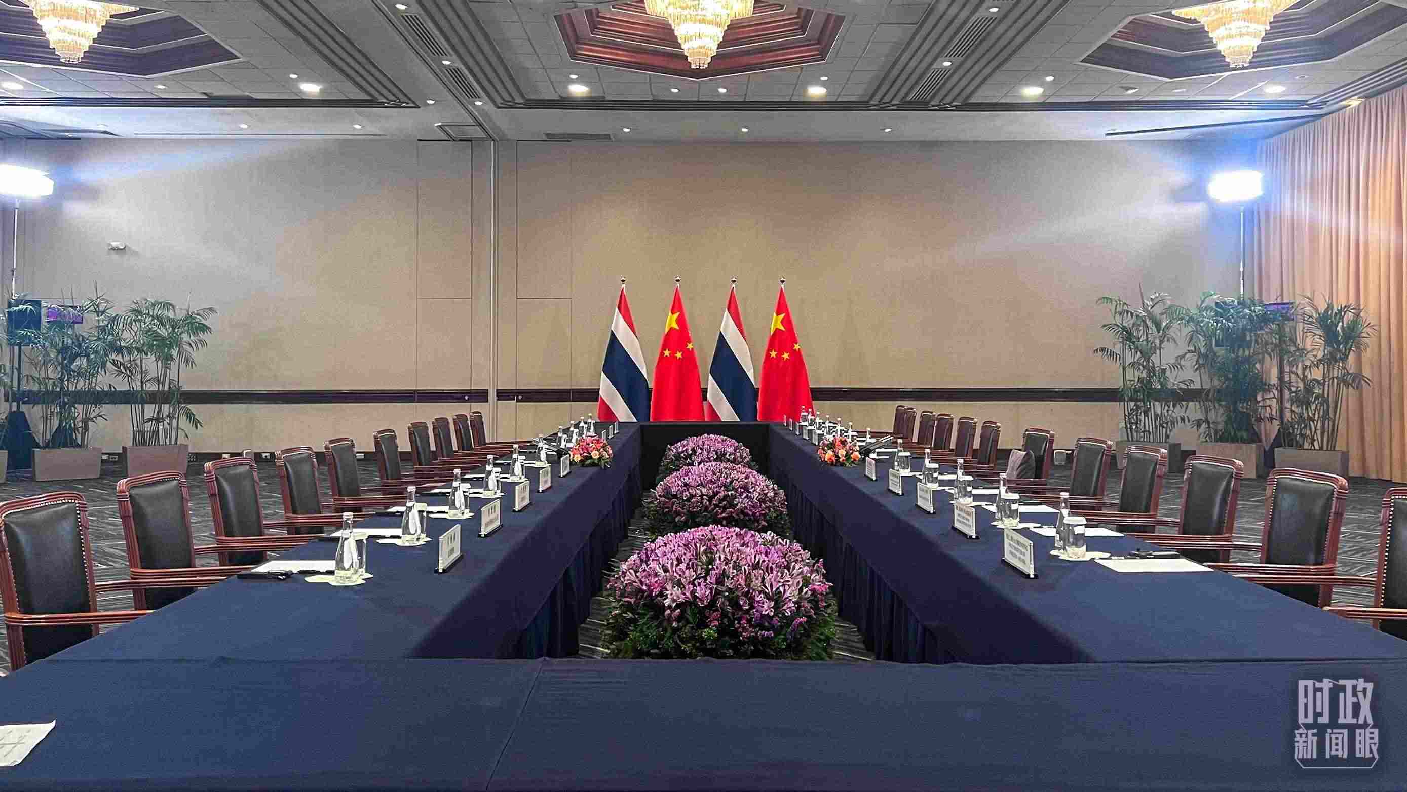 △會見現(xiàn)場的中泰兩國國旗。(總臺央視記者范一鳴拍攝)