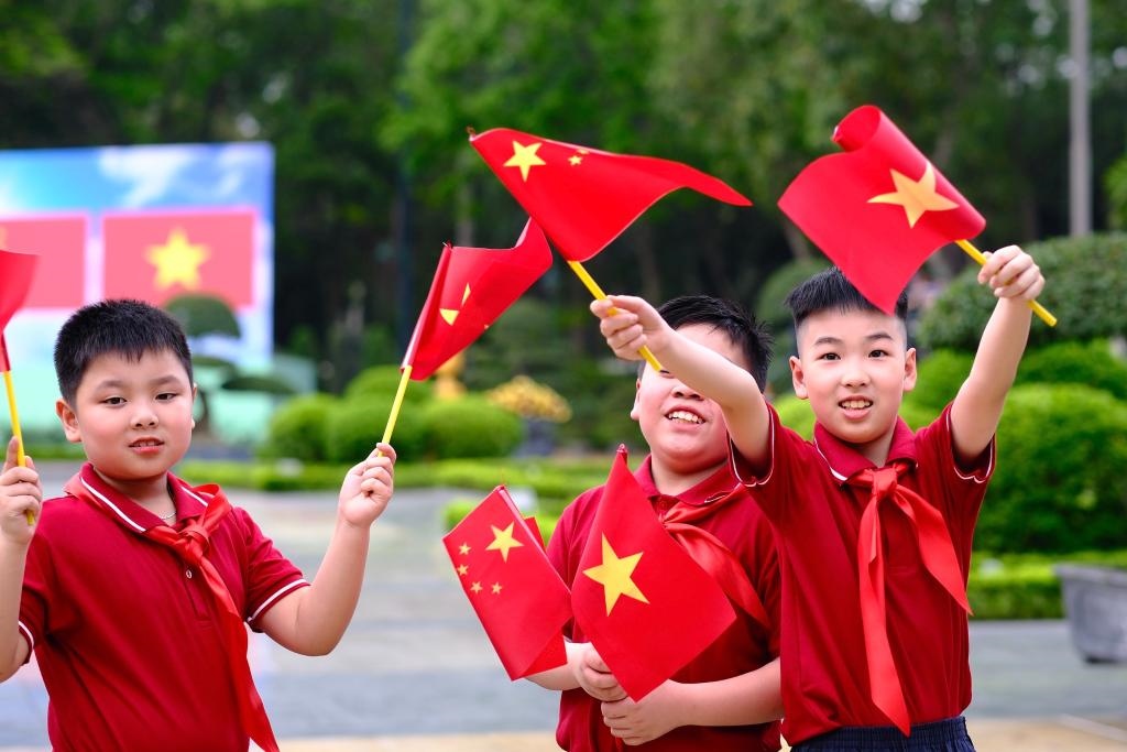 主席府廣場上,五星紅旗同金星紅旗迎風(fēng)飄揚,200多名越南少年兒童揮舞旗幟,熱烈歡迎習(xí)近平到訪。