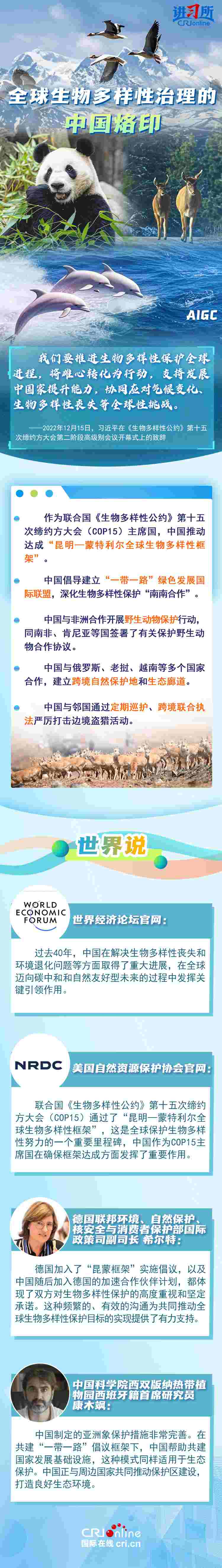 “心往一處想、勁往一處使,共建地球生命共同體?!弊鳛樽钤绾炇?、批準《生物多樣性公約》的締約方之一,生物多樣性保護已經(jīng)上升為中國的國家發(fā)展戰(zhàn)略。國際人士表示,中國的一系列舉措體現(xiàn)出對生態(tài)環(huán)境保護的堅定決心,同時,中國依托共建“一帶一路”倡議等國際合作機制,為推動全球生物多樣性保護提供了有力支持,在邁向自然友好型未來的過程中發(fā)揮關(guān)鍵的引領(lǐng)作用。