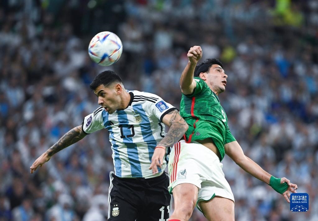 11月26日,阿根廷隊(duì)球員克·羅梅羅(左)和墨西哥隊(duì)球員勞爾·希門尼斯在比賽中爭頂。新華社記者 李尕 攝