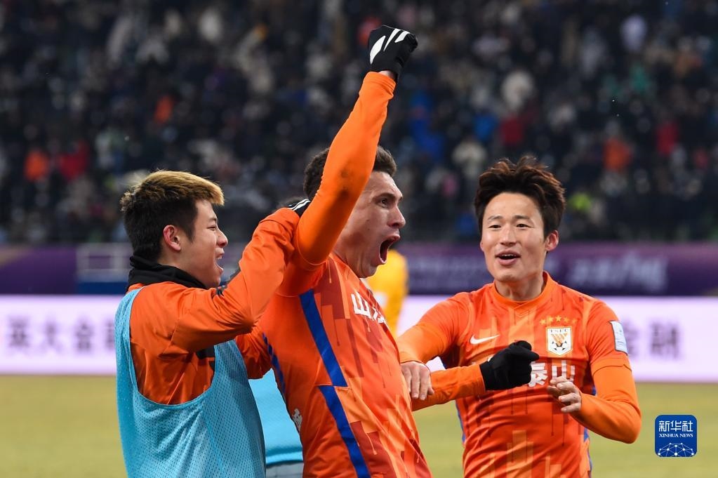 1月15日,山東泰山隊(duì)球員莫伊塞斯(中)在比賽中慶祝得分。