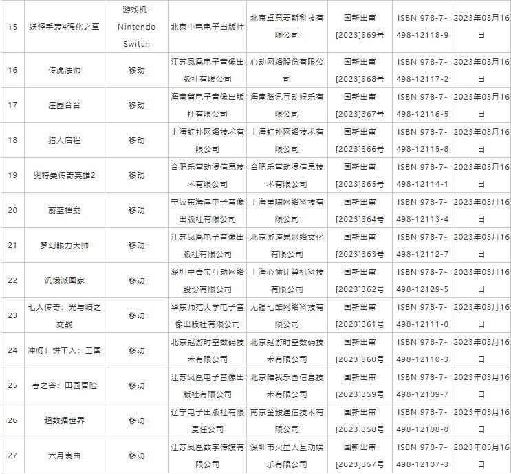 人民網(wǎng)北京3月21日電 (記者楊虞波羅)據(jù)國家新聞出版署官網(wǎng)消息,3月20日,2023年進(jìn)口網(wǎng)絡(luò)游戲?qū)徟畔⒄桨l(fā)布,共27款游戲獲得游戲版號(hào),其中包含22款移動(dòng)游戲、3款PC游戲、1款雙端游戲、1款NS游戲機(jī)游戲。