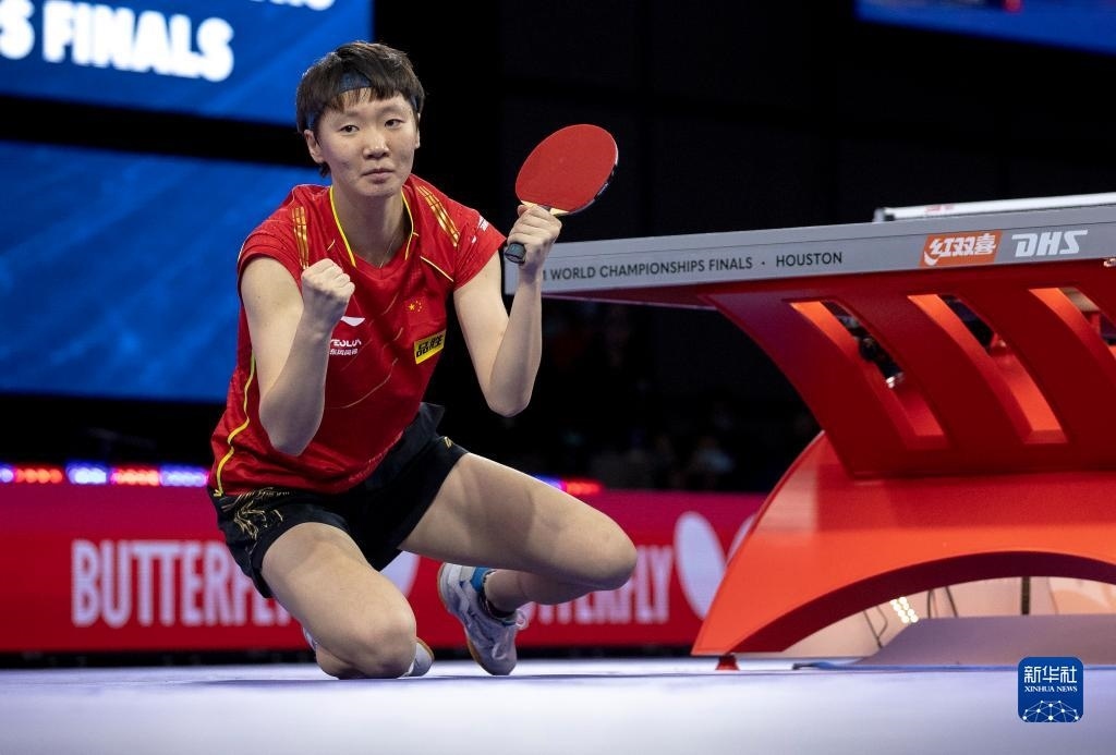 2021年11月29日,王曼昱慶祝奪冠。當(dāng)日,在美國休斯敦進(jìn)行的2021世界乒乓球錦標(biāo)賽女子單打決賽中,中國選手王曼昱以4:2戰(zhàn)勝隊友孫穎莎,奪得冠軍。 新華社瓦格納攝