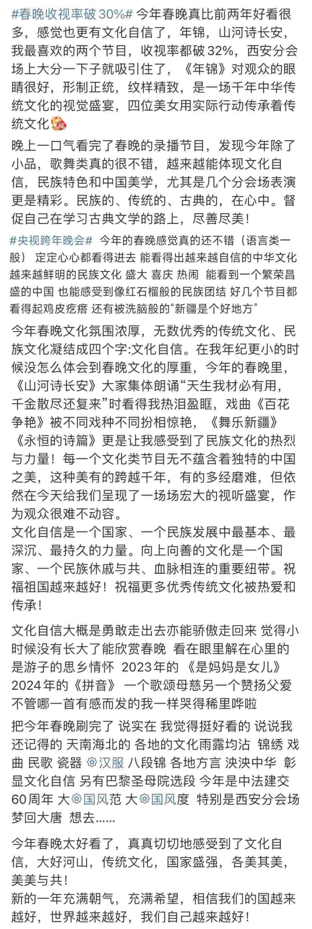 春晚的文化展現(xiàn),在國(guó)人中也引起了熱烈反響。“每一個(gè)文化類節(jié)目都蘊(yùn)含著獨(dú)特的中國(guó)之美,這種美有的跨越千年,有的多經(jīng)磨難,春晚給我們呈現(xiàn)了一場(chǎng)場(chǎng)宏大的視聽(tīng)盛宴,作為觀眾很難不動(dòng)容”“從今年春晚真真切切地感受到了文化自信,大好河山,傳統(tǒng)文化,國(guó)家強(qiáng)盛,美美與共”“文化傳統(tǒng)特色給各個(gè)節(jié)目都刷了創(chuàng)意的漆,霸氣從節(jié)目中升騰,自信從感嘆中生發(fā),真妙”......