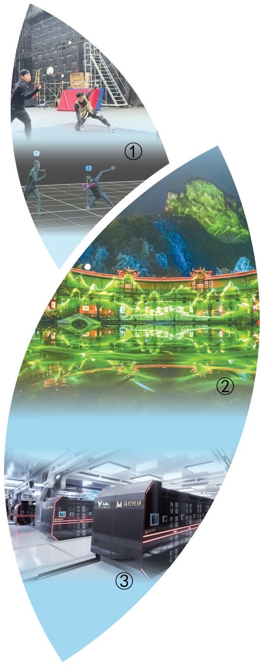 圖①:動(dòng)捕演員進(jìn)行高速高精度運(yùn)動(dòng)捕捉。 圖②:《德夯幻境》室外大劇場現(xiàn)場。圖③:馬欄山視頻超算中心。以上圖片均為受訪者提供