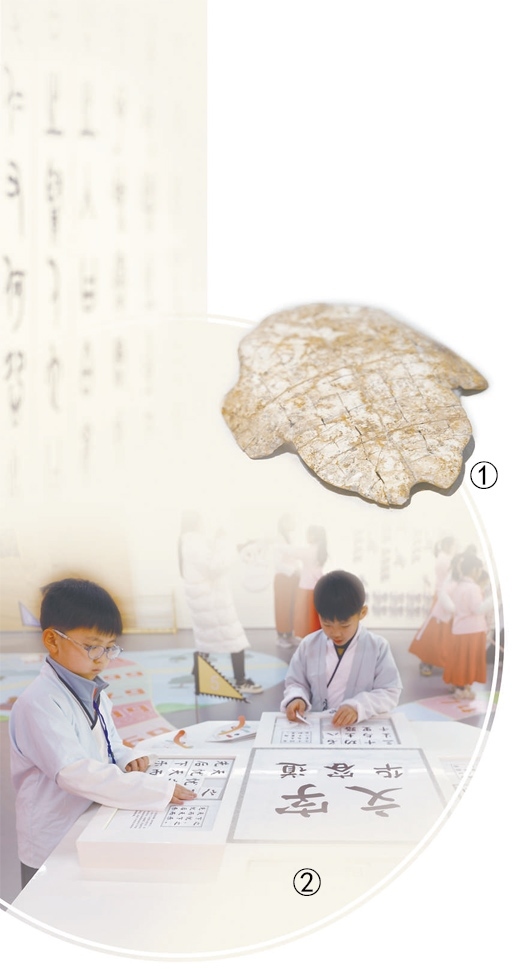 圖①:中國文字博物館館藏的卜甲。 丁俊豪攝(影像中國) 圖②:學(xué)生在博物館體驗(yàn)“文字華容道”游戲。楊少甜攝