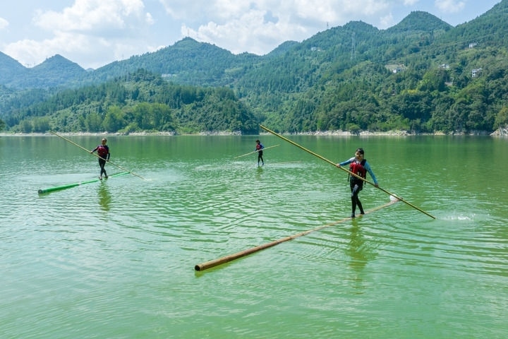 2023年9月15日,愛好者在湖北宣恩雙龍湖上練習(xí)“獨竹漂”(無人機照片)。新華社發(fā)(王法鈞攝)