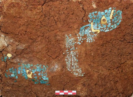 湖北黃陂盤龍城遺址楊家灣M17出土的金片綠松石鑲嵌飾。(全國十大考古新發(fā)現(xiàn)活動(dòng)辦公室供圖)