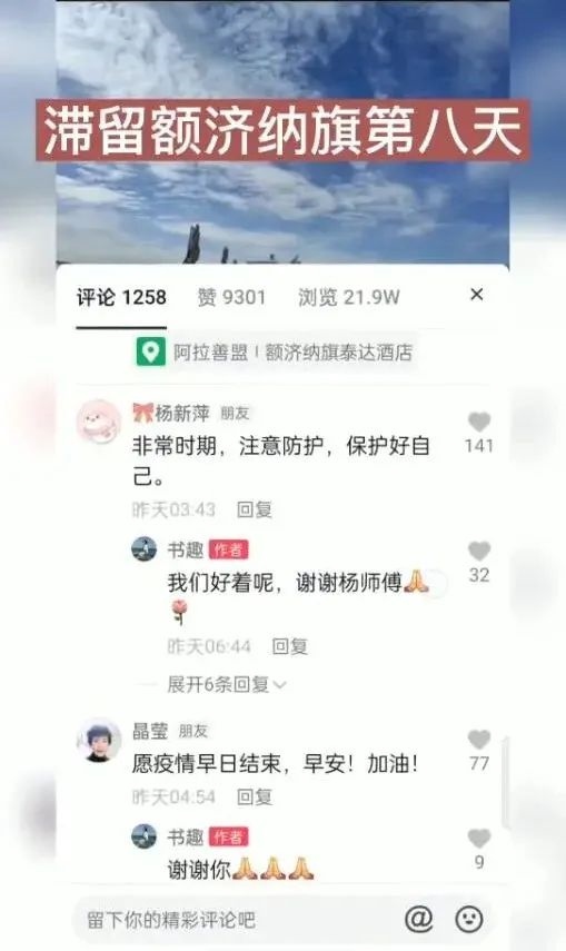 視頻發(fā)出數(shù)小時(shí)就吸引了上萬(wàn)的瀏覽量。視頻發(fā)布者王女士在視頻中呈現(xiàn)一家人滯留額濟(jì)納旗現(xiàn)況的同時(shí),也給和她同樣滯留額濟(jì)納旗的近萬(wàn)名游客鼓勁:“如果你此時(shí)正在阿拉善,愿你如胡楊般堅(jiān)強(qiáng),積極應(yīng)對(duì)疫情。”