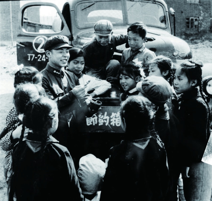 ↑1959年2月,雷鋒所在鞍鋼洗煤車間吊車組被評為紅旗組,這是雷鋒(后排右二)和工友合影。