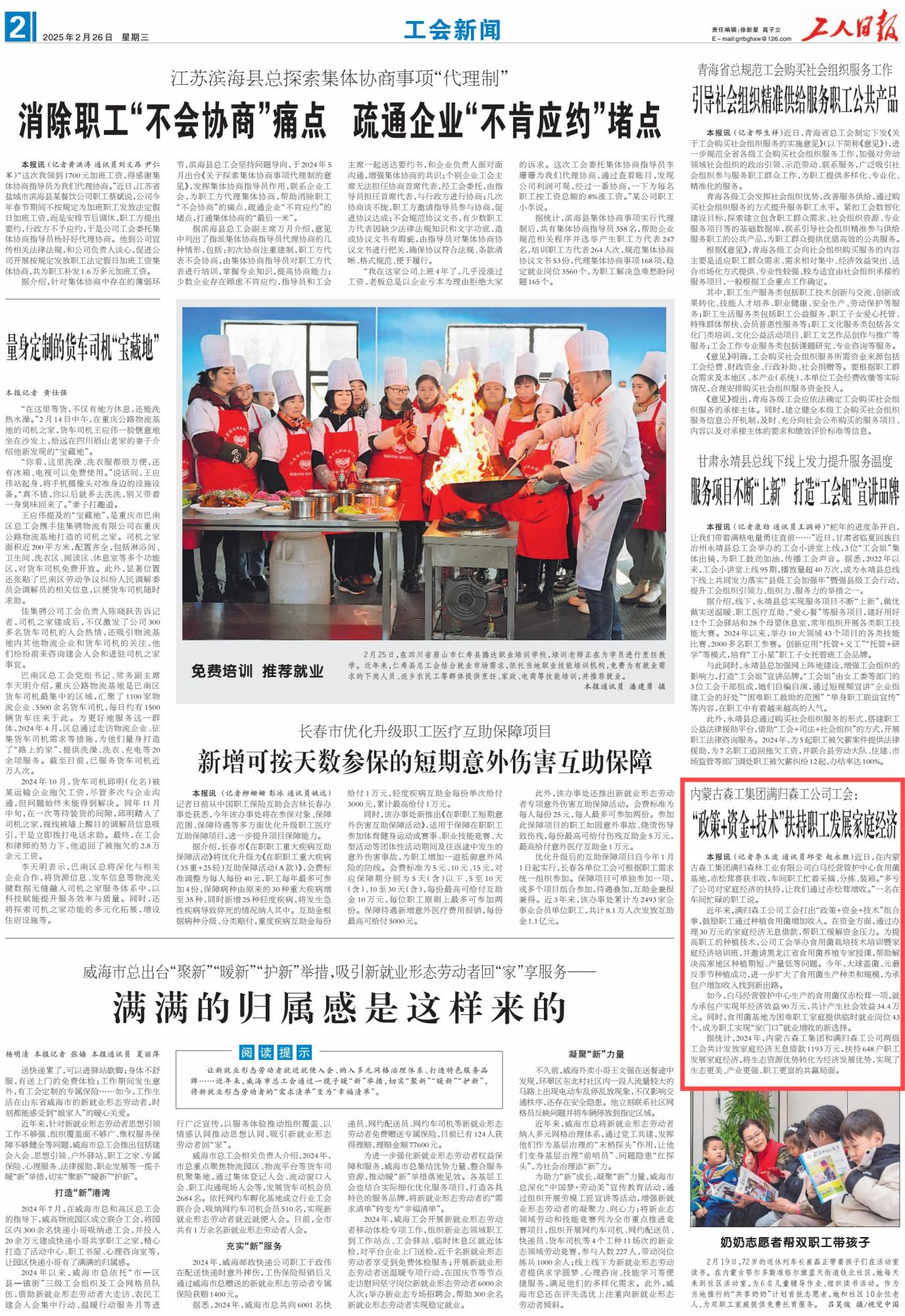 2025年2月26日,《工人日報》第2版刊發(fā)題為《內蒙古森工集團滿歸森工公司工會:“政策+資金+技術”扶持職工發(fā)展家庭經濟》的消息,介紹了近年來,內蒙古森工集團滿歸森工公司工會打出“政策+資金+技術”組合拳,鼓勵職工通過種植食用菌增加收入。