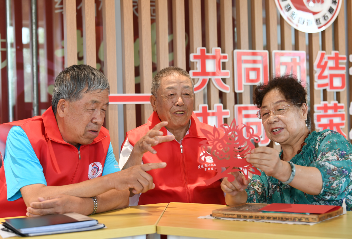 包頭市昆都侖區(qū)友誼19小區(qū)社區(qū)黨群服務(wù)中心紅石榴宣講團成員與社區(qū)居民一起剪紙。