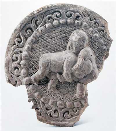 戰(zhàn)國時期樹木鳥獸紋瓦當(dāng)。