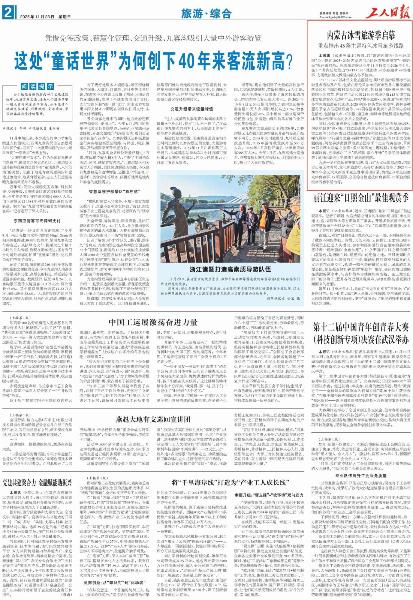 2025年11月23日,《工人日報(bào)》第2版刊發(fā)題為《內(nèi)蒙古冰雪旅游季啟幕 重點(diǎn)推出45條主題特色冰雪旅游線路》的文章,報(bào)道了2025-2026內(nèi)蒙古自治區(qū)冰雪旅游季近日在“中國冷極”根河市啟幕。冰雪旅游季從今年11月持續(xù)至2026年3月,陸續(xù)推出“3+13+143”項(xiàng)活動、45條線路和48場賽事。