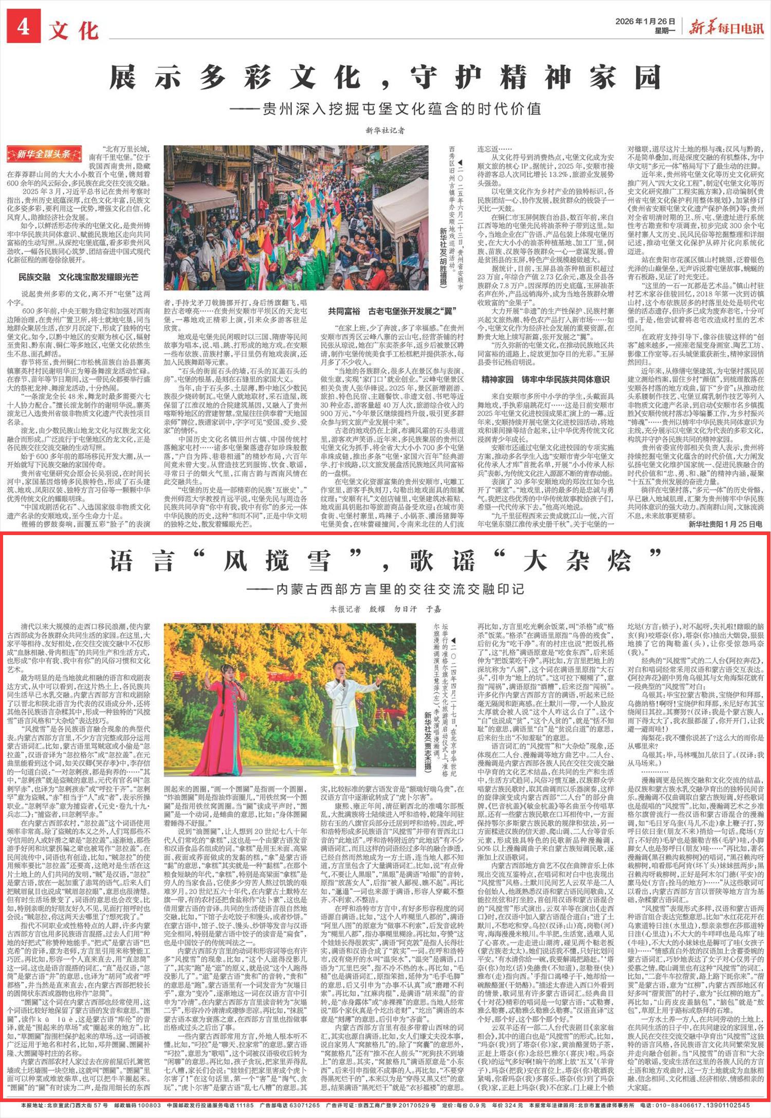 2026年1月26日《新華每日電訊》第4版刊發(fā)了《語言“風(fēng)攪雪”,歌謠“大雜燴”——內(nèi)蒙古西部方言里的交往交流交融印記》的文章,報道了內(nèi)蒙古西部方言和戲劇除了以晉北和陜北語言為代表的漢語成分外,還將其他各民族語言雜糅其中,形成一種獨特的“風(fēng)攪雪”語言風(fēng)格和“大雜燴”表達(dá)技巧。