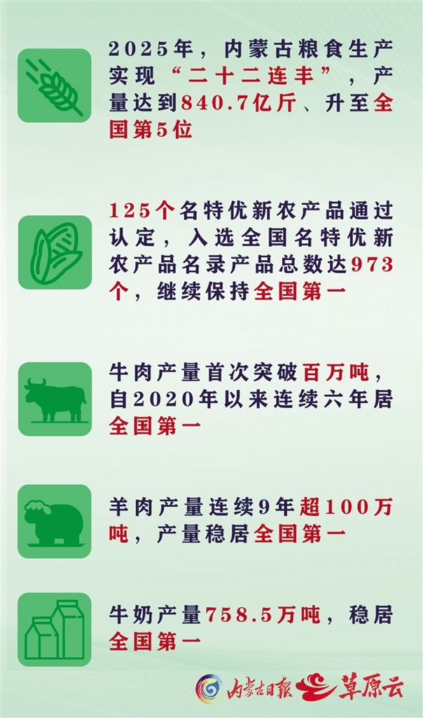 從河套平原的繁忙備耕到錫林郭勒草原的牛羊成群,再到敕勒川的奶香四溢,內(nèi)蒙古以“糧倉”更實、“肉庫”更足、“奶罐”更豐的堅實底氣,扛起建設國家重要農(nóng)畜產(chǎn)品生產(chǎn)基地的使命擔當。