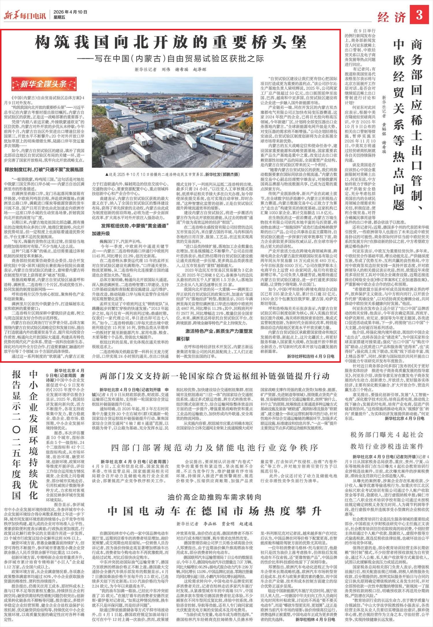 2026年4月10日,《新華每日電訊》第3版刊發(fā)題為《構筑我國向北開放的重要橋頭堡——寫在中國(內蒙古)自由貿(mào)易試驗區(qū)獲批之際》的文章,報道了《中國(內蒙古)自由貿(mào)易試驗區(qū)總體方案》4月9日對外發(fā)布。內蒙古自貿(mào)試驗區(qū)的建設,填補了我國北部沿邊地區(qū)自貿(mào)試驗區(qū)布局的關鍵一環(huán),進一步完善了國家開放格局,筑牢向北開放戰(zhàn)略支點。