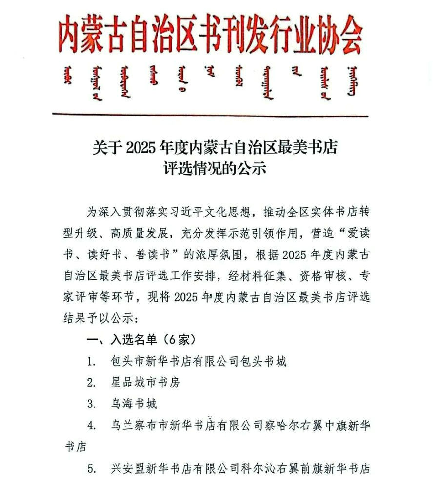 關(guān)于2025年度內(nèi)蒙古自治區(qū)最美書店評(píng)選情況的公示