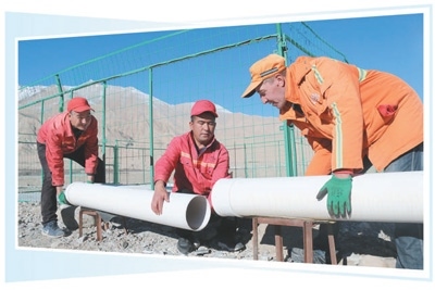 穆薩·克日木(中)和工友修復大橋排水管道。 王有文攝